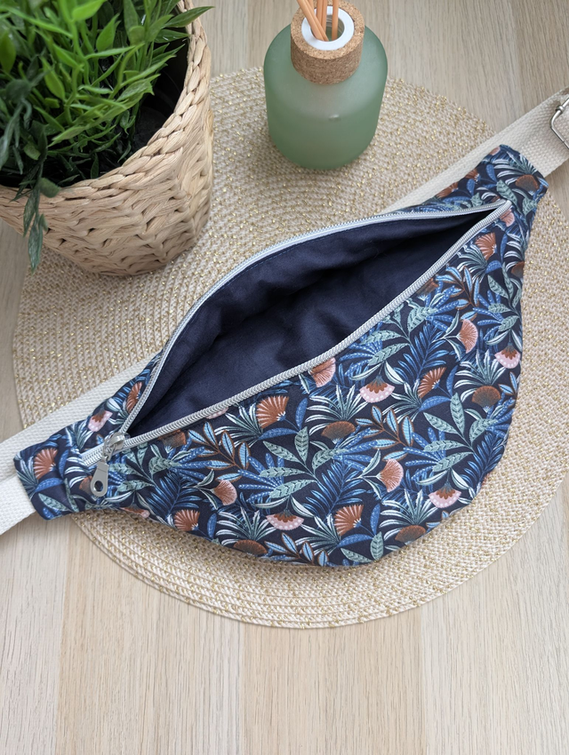 🌸 Extérieur en tissu exotique, intérieur en coton uni bleu marine.
