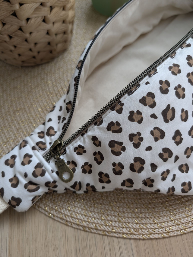 🌸 Extérieur en tissu léopard, intérieur en coton uni beige.