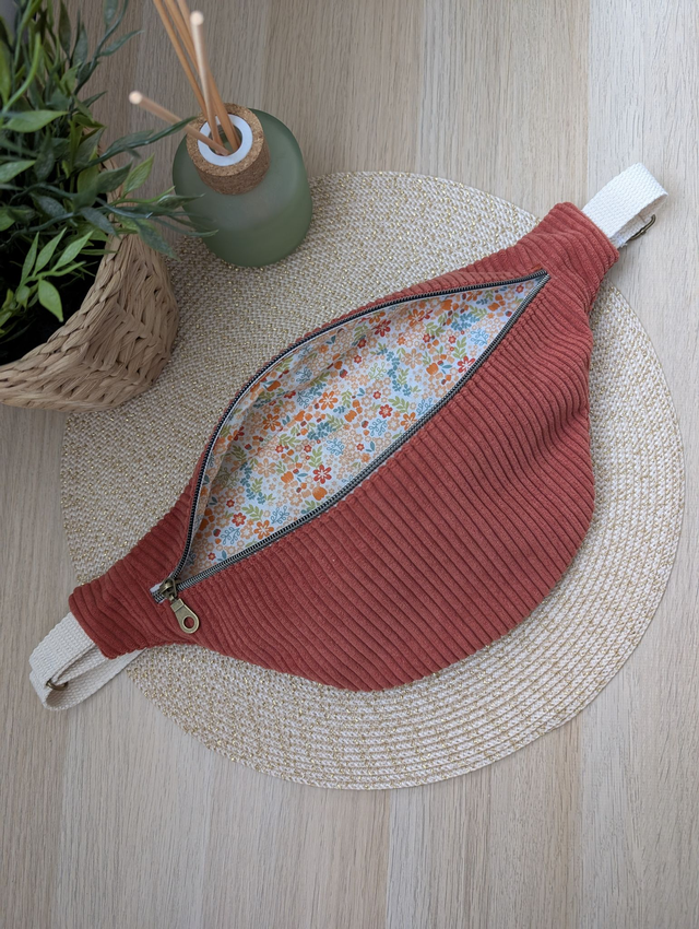 🌸 Extérieur en velours côtelé orange, intérieur en coton à motifs.